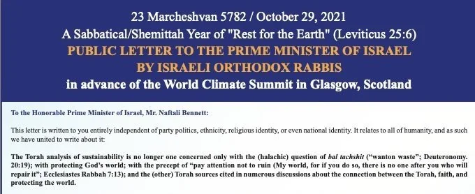 Along these lines, in October 2021, a group of leading Israeli Religious Zionist rabbis wrote an open letter to then-Prime Minister, Naftali Bennett, on the eve of his travelling to the Scotland to represent Israel at the World Climate Summit, stating that as Jews we are obligated to address climate change and urging him to enlist the State of Israel’s full participation in global efforts.