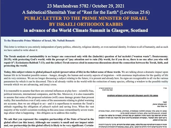 A Public Letter from Leading Israeli Orthodox Rabbis to Former Prime Minister Naftali Bennett about Climate Change (2021)